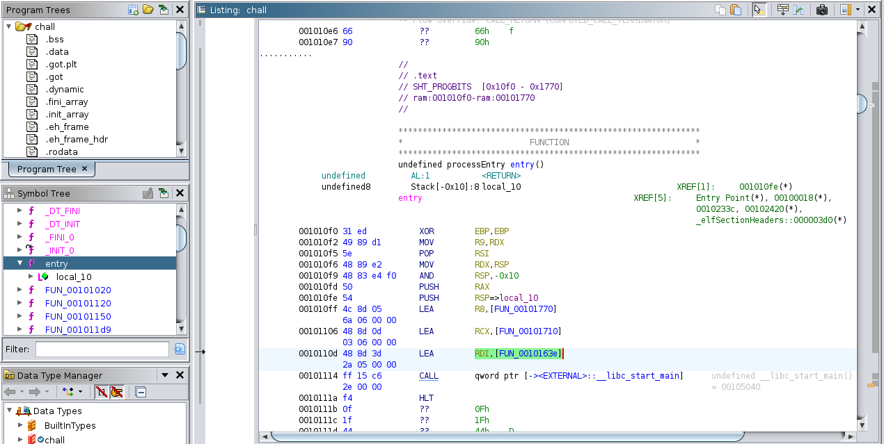 Lets open up Ghidra and try to reverse engineer this. First step is to identify the main function. Checking the entry function that runs at the start we can find what function is loaded before calling libc_start_main. Thats our main function