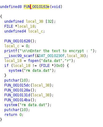 We can see the Enter the text to encrypt string which means its in fact the main function that runs at the start. After receiving input from the user, program checks if file data.dat exists and deletes it if it does. Then 4 functions are called. Function FUN_0010128a does nothing, so let’s analyze the other 3.
