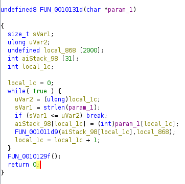 In this function there is a loop that iterates through each character of the user input and passes it to the FUN_001011d9 function