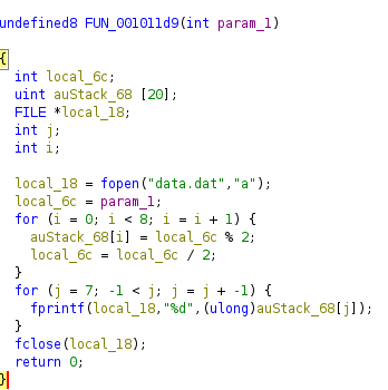 Function FUN_001011d9 converts the ASCII character to an 8 bit binary representation and then writes it to data.dat file in the reverse order. Having followed this flow, we can go back to FUN_001014ba which is the last function called in main