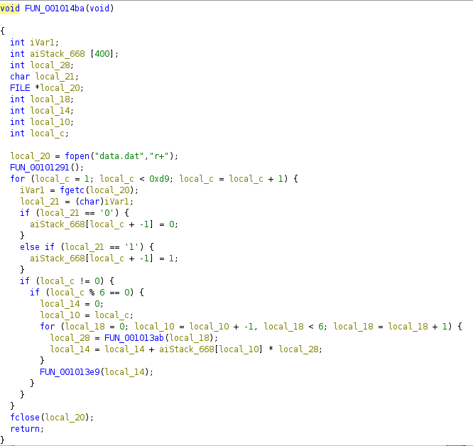 We see that the data.dat file is opened, a FUN_00101291 is called which does nothing and then there is a for loop that iterates as long as the local_c is less than 0xd9, which is 217 in decimal. So there is 216 iterations. Why 216? Because our input has length of 27 and each character got converted to an 8 bit binary which means that there is 27 * 8=216 bits. Inside the for loop the first two if statements check the value of character read from file. If the value is ‘0’ then 0 is added to an array, if it’s ‘1’ then 1 is added