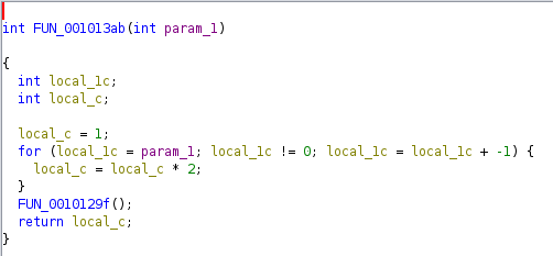 There is a for loop that iterates param_1 times and it multiplies local_c by 2 - which starting value is 1. FUN_0010129f does nothing. Essentially the returned value is 2^param Let’s go back to the caller function