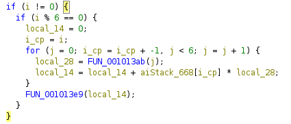 As previosly mentioned local_14 stores the sum of a bit at index i multiplied by local_28 (2^j). So it essentially converts a 6 bit binary to decimal. After the loop there is the last call to another function called FUN_001013e9 with local_14 as an argument