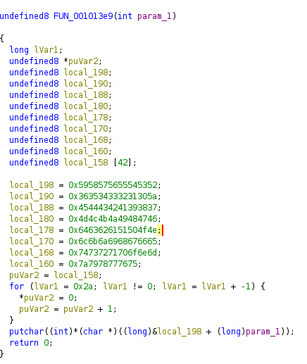 Here we see a bunch of variables storing hex values. After converting them to ASCII we get a YXWVUTSR6543210ZEDCBA987MLKJIHGFdcbaQPONlkjihgfetsrqponmzyxwvu. However since this is a x86 program it uses little endian system to store bytes in memory, which essentially means that each value is stored in reversed order. So in memory it would look like this: RSTUVWXYZ0123456789ABCDEFGHIJKLMNOPQabcdefghijklmnopqrstuvwxyz. Then there is a for loop that just puts 0s inside the local_158, which is a 42 long array. Now the important part happens in putchar function. It takes the address of the first byte of local_198 with added value of param_1, which acts as an offset to the address. Then it takes 1 byte from the calculated address (char *), converts it to int and the putchar function converts it back to char.