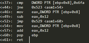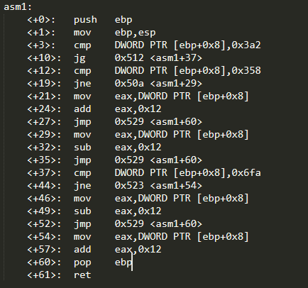 We start with another comparison between our argument and 0x6fa and then we jump if the values are not equal. In our case they are equal so we move on to the next instructions. We move our argument to eax, we substract 0x12 from it and jump to <+60> which is the end of the function. So the result is 0x6fa - 0x12 = 0x6e8