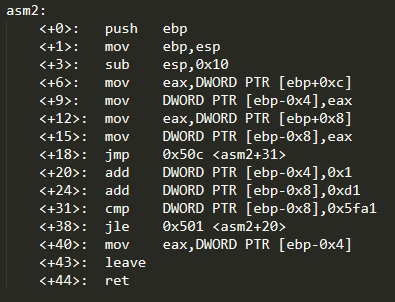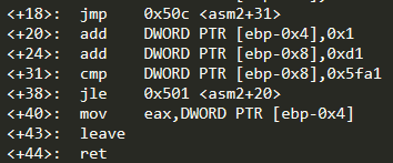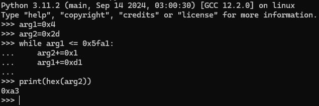 After that we jump to <+31> and we compare our first argument to 0x5fa1. Since its lower than the constant value, the jump if less or equal gets executed and we go to <+20> line where we add 0x1 to the second argument and then 0xd1 to the first one. We compare values again, creating a loop that will end whenever the value at [ebp-0x4] surpasses 0x5fa1. Then the value from [ebp-0x4] is moved to eax and is returned by the function. Now that we’ve understood the code we can write it in python and calculate the returned value