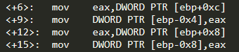 With these 4 mov instructions we put our arguments on the stack. Firstly we move the second argument ([ebp+0xc]) to eax and then we put it on the stack at [ebp-0x4]. Its the same thing with the first argument which ends up at [ebp-0x8]
