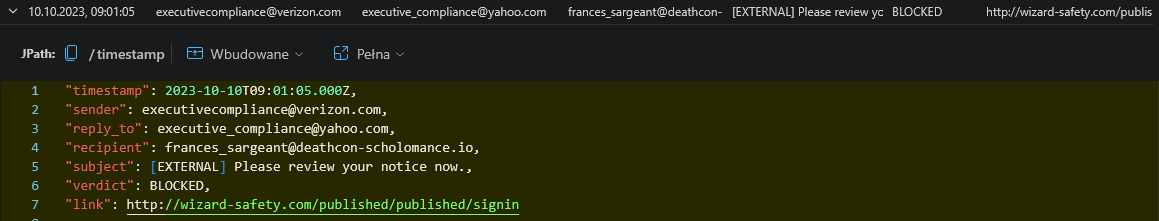 | where sender !has "researchcompliance.biz"