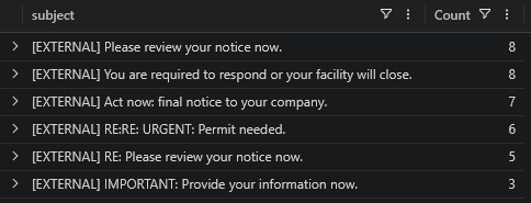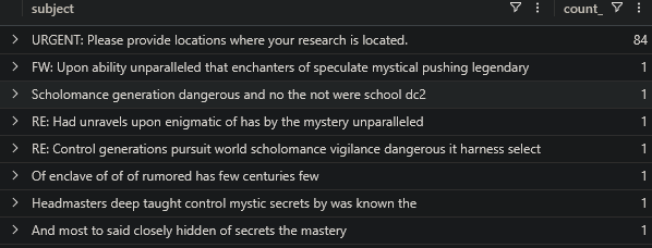 Oh no! You’ve been hit by something, someone, or some force that has stolen something from your enclave. You’re not sure, but you need to investigate. There was a lot of emails going around about regulation and compliance. Search for these terms in the Emails table.
