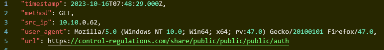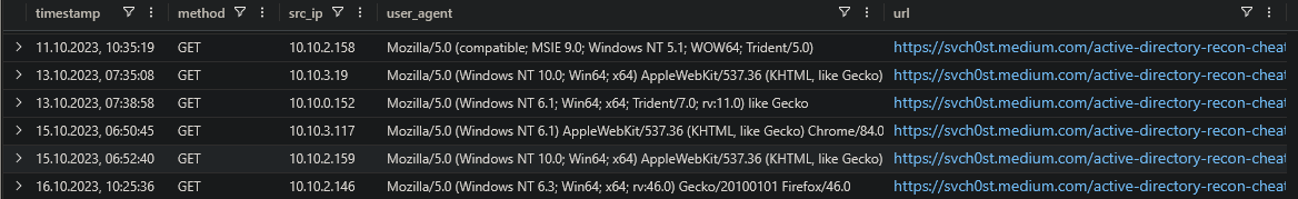 | where src_ip in (usr_ip) and method == "GET" and url contains "recon" and timestamp > datetime(2023-10-10T06:14:13.000Z)