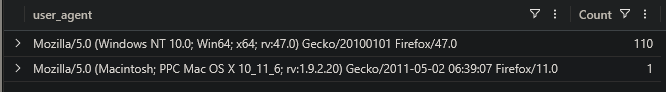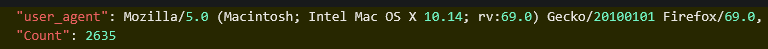 | where user_agent == "Mozilla/5.0 (Macintosh; Intel Mac OS X 10.14; rv:69.0) Gecko/20100101 Firefox/69.0"