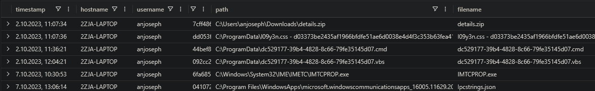 | where hostname == "2ZJA-LAPTOP" and timestamp > datetime(2023-10-02T11:07:30.000Z)